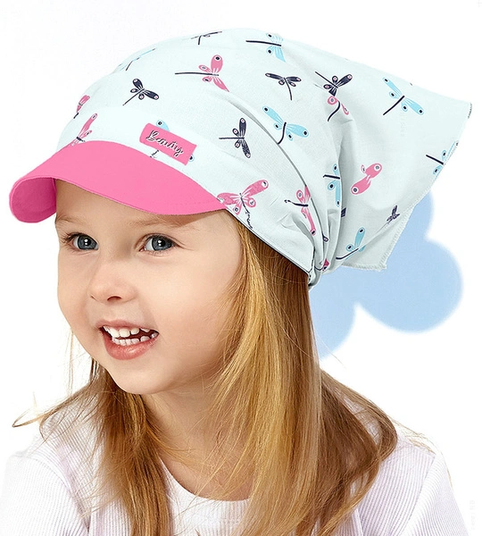 - Chustka na głowę dziewczynki z daszkiem. Chustka utrzymuje się na głowię dzięki gumce - wszytej z tyłu, jest doskonałym nakryciem głowy na lato. Chroni głowę przed słońcem, jednocześnie jest lekka i przewiewna. Wzór w ważki.