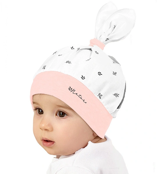 - Czapka na lato dla dziewczynki. Dół czapki to miękki ściągacz, a góra uszyta z dwóch materiałów połączonych u góry elastyczną gumką tworzącą supełek. Po bokach czapki pozostawiono otwory, które wentylują głowę i mogą być miejscem na dwa kucyki.