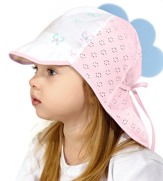 z materiału we wzór w motylki. Tył czapki odszyty z materiału w dziureczki — wentyluje główkę.
