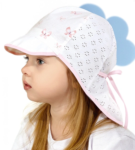 z materiału we wzór w motylki. Tył czapki odszyty z materiału w dziureczki — wentyluje główkę.