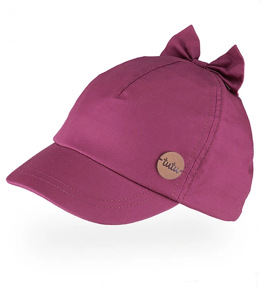 - Czapka z daszkiem dziewczęca uszyta z bawełny, zabezpieczonej filtrem UV +30. Obwód czapki regulowany rzepem. U góry czapki ozdobna kokardka.