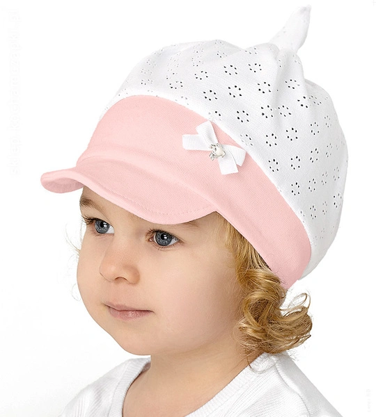 Opinie o Czapka z daszkiem dla dziewczynki, ażurek, biały + róż pudrowy, Biawa, 48-50 cm