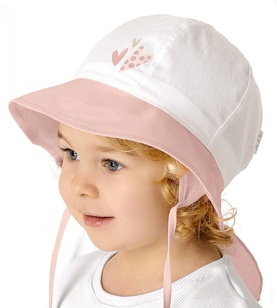 - Wiązany kapelusz dla dziewczynki na upalne dni. Zapewni zarówno ochronę przed słońcem, jak i modny wygląd. Z przodu rondko wydłużone w formie daszku, który zamienia się w kokardę do wiązania z tyłu.