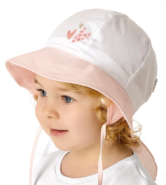 - Wiązany kapelusz dla dziewczynki na upalne dni. Zapewni zarówno ochronę przed słońcem, jak i modny wygląd. Z przodu rondko wydłużone w formie daszku, który zamienia się w kokardę do wiązania z tyłu.