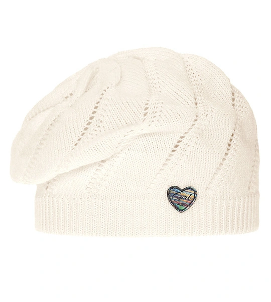- Ażurowy beret wiosenny, ze ściągaczem, który dobrze dopasowuje czapkę do obwodu głowy. Czapka z naszywką w kształcie serca.