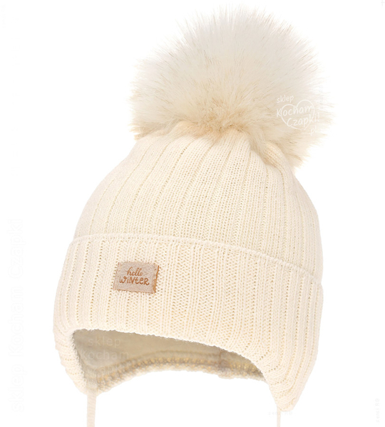 - Czapka zimowa dla dziewczynki z pomponem i sznurkami do wiązania. Podszyta miękkim polarem bawełnianym, ma podwijany dół i krój zasłaniający uszy. Ciepła i wygodna na zimę.