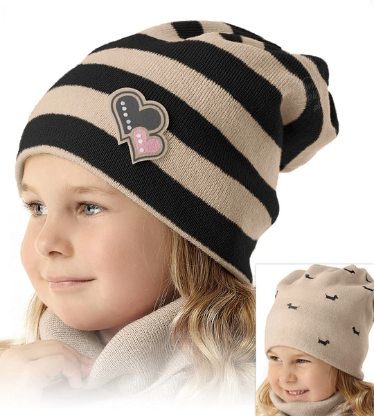 Model 2 w 1 pozwala zmieniać wygląd w zależności od nastroju – z jednej strony czapka ma kolorowe paski z uroczą aplikacją z serduszkami, a z drugiej gładki wzór z nadrukiem w małe pieski – jamniki. Dzięki temu to praktyczny i zabawny dodatek do dziecięcej garderoby.