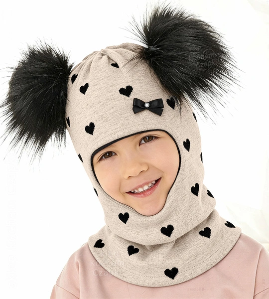 - Ciepła kominiarka dla dziewczynki na zimę, uszyta z dzianiny 90% akryl i 10% wełny, z bawełnianym polarem wewnątrz. Ma dwa futerkowe pompony, wzór w serduszka i kokardkę. Chroni głowę i szyję, zapewniając wygodę w zimowe dni podczas zabaw i spacerów.