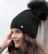 Elegancka czapka damska zimowa, wełniana z pomponem z jenota, Jenova, czarna, 55-59 cm